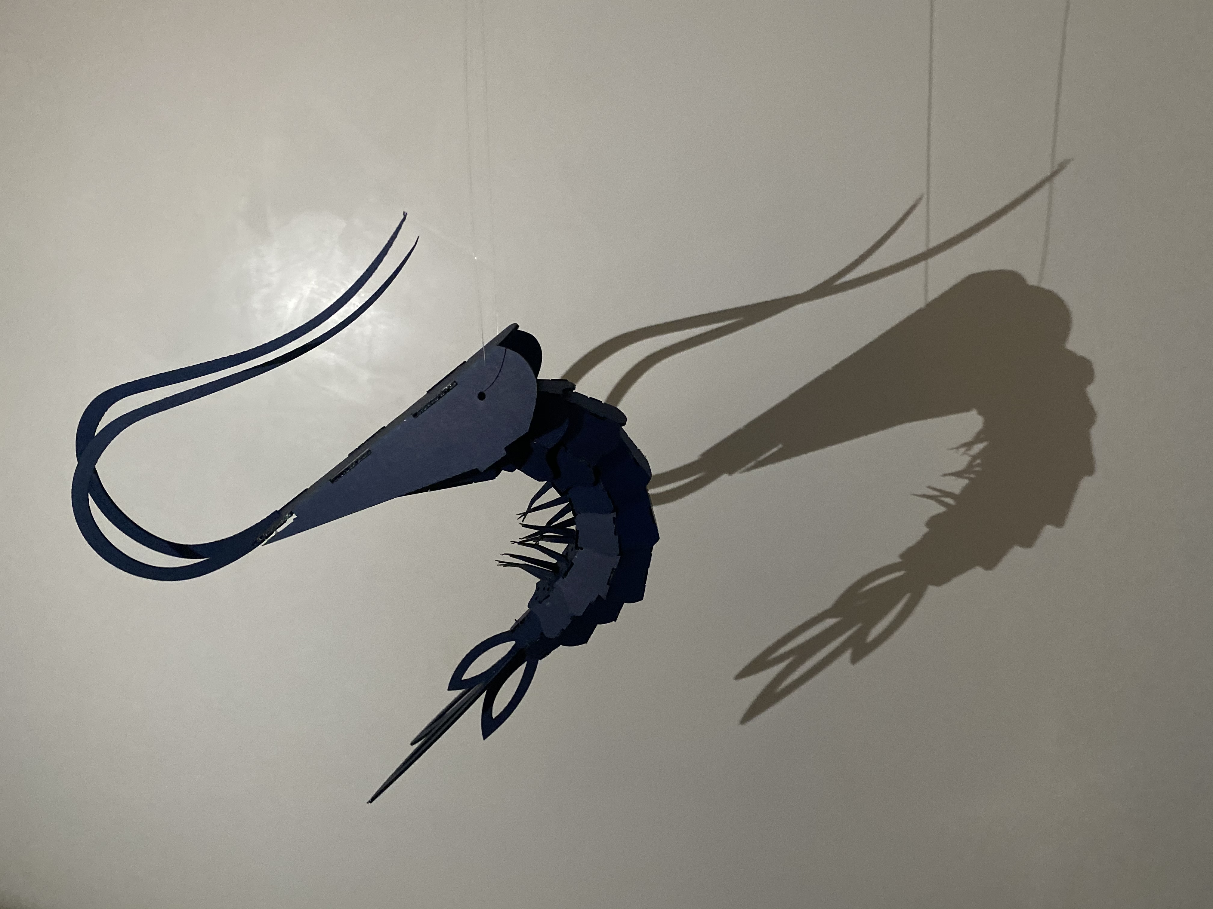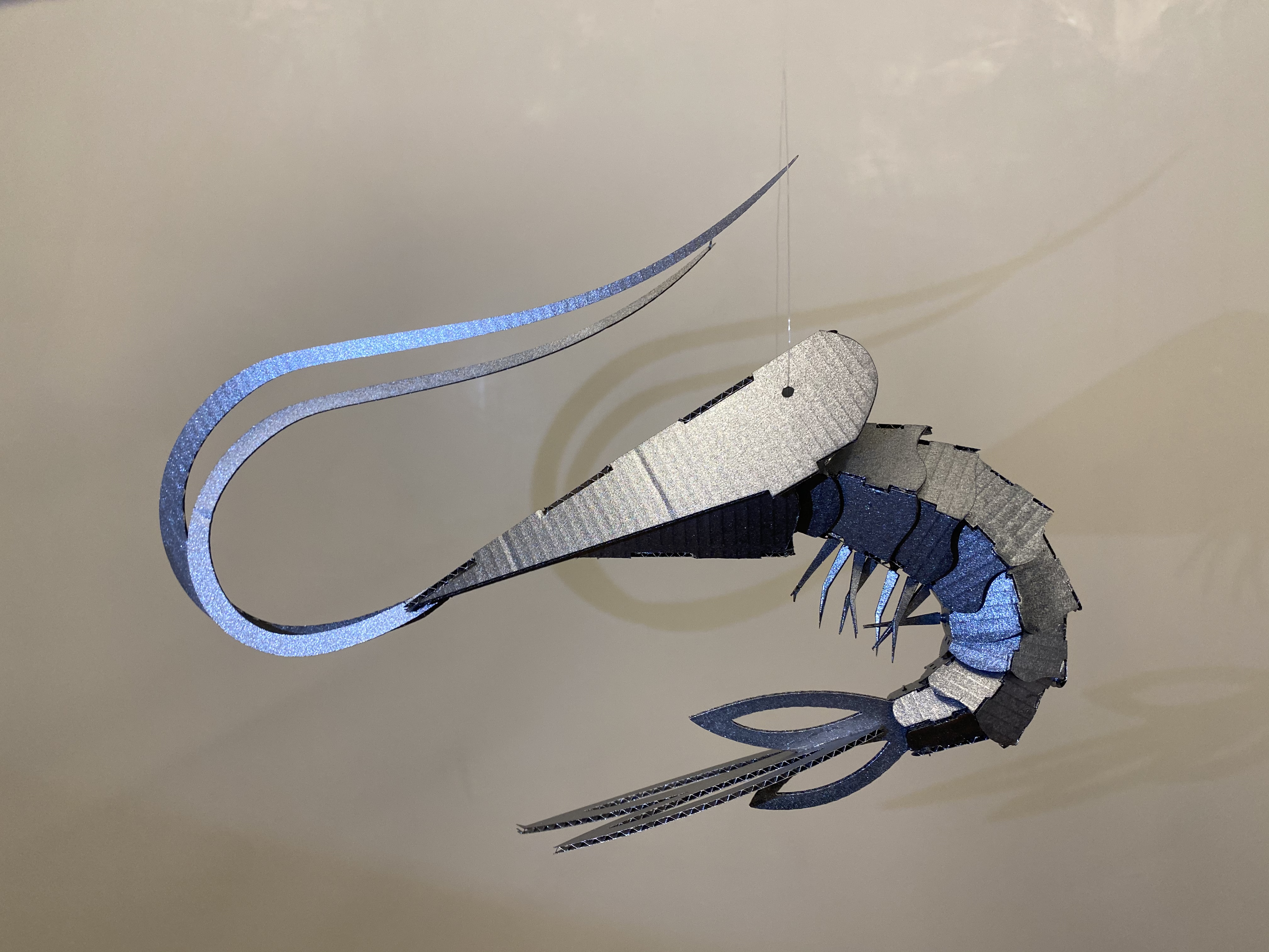 Outcome. A suspended mobile that abstracts the shrimp’s elongated body, segmented shell, and antennae into a lightweight laser-cut cardboard assembly — balancing structural clarity with a sense of motion.